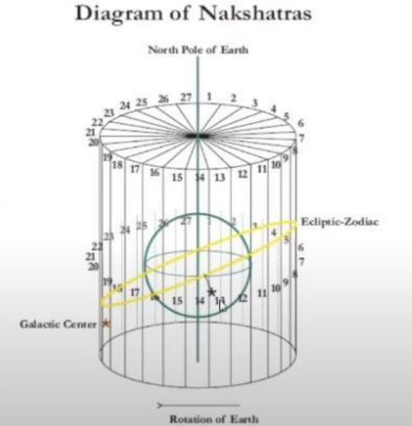 Nous adoptons donc le Dhruva Galactic Center / Middle of Mula d’Ernst Wilhelm. Le centre galactique immutable / Milieu de la nakshatra Mula) : Dhruva est un type de projection propre qui respecte la projection des étoiles à la façon des ouvrages antiques indiens via les pôles célestes , comme dans le Surya Siddantha parlant des nakshatras, les demeures lunaires sidérales indiennes (avantage, cela correspond aussi peu ou prou à l’ayanamsha traditionnel basé sur Revati Cette projection n’est pas une projection directe sur l’écliptique (qui correspond à ce que fait Lahiri) :